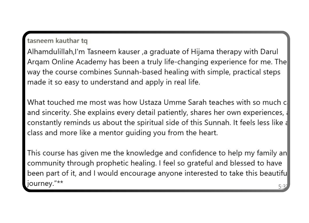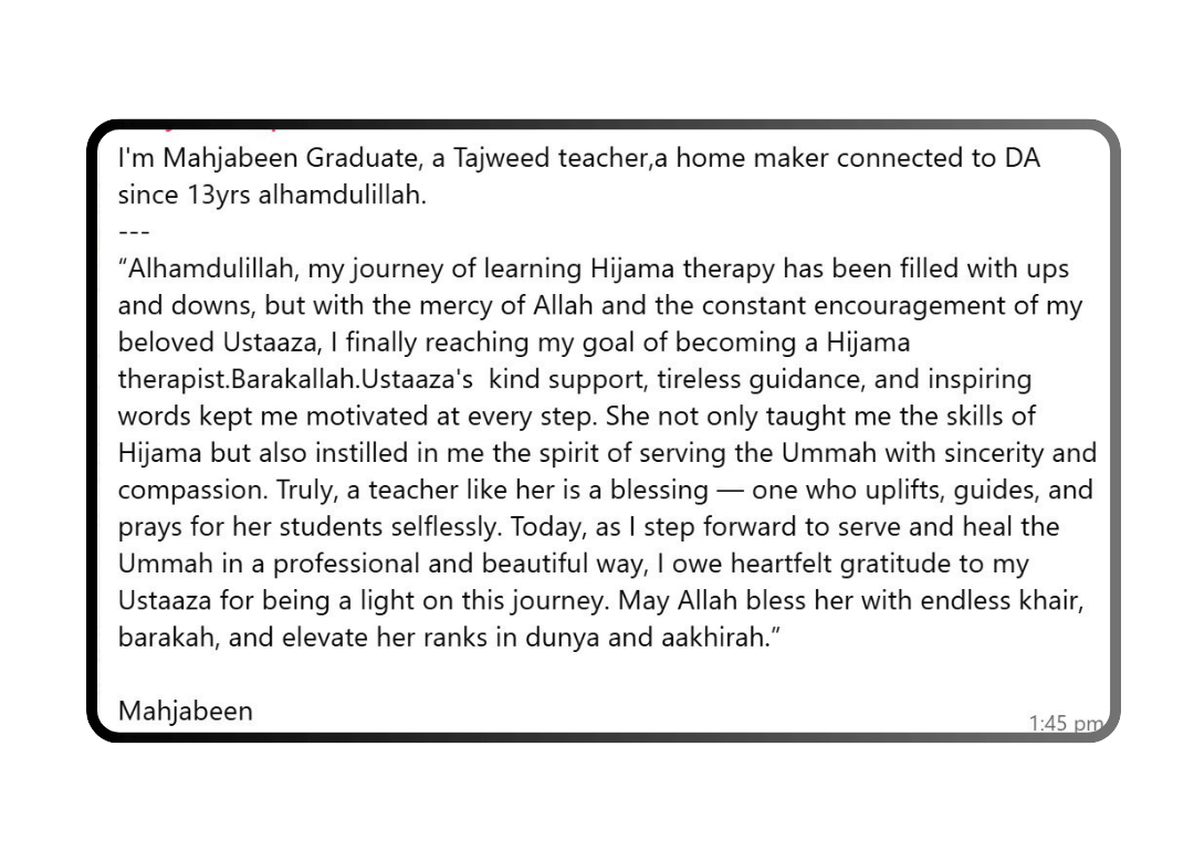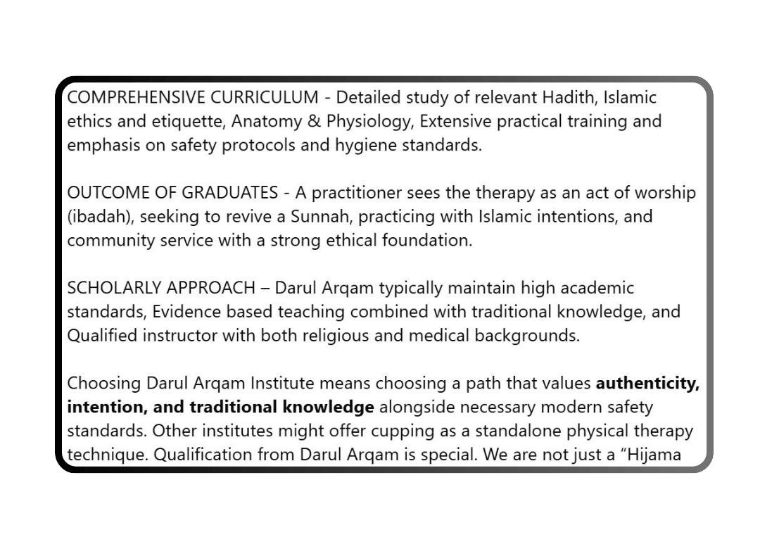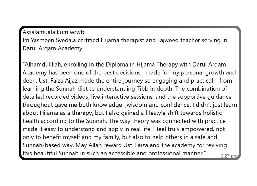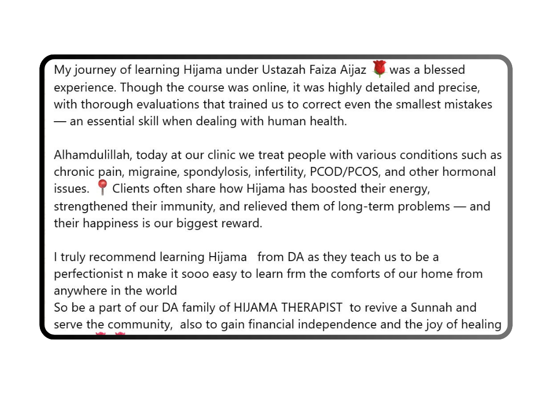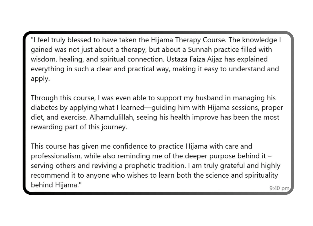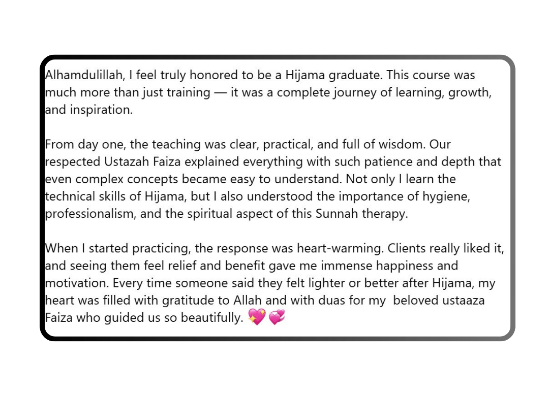 This is not a typical sales pitch. It’s a genuine, heartfelt session packed with eye-opening knowledge and a roadmap to a new life. At the end, we will share details of our Hijama Certification Program — but only for those who feel ready to start their journey.