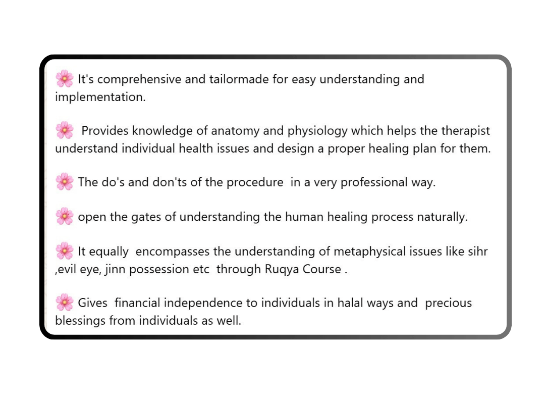 This masterclass is for muslim men & women who always had a dream to heal, those who once aspired to become a doctor or therapist, and for anyone who now wants to earn with dignity, work from home, and revive a powerful Sunnah. Whether you're a housewife, a career-break mother, or simply someone who wants to make a difference, this is for you.